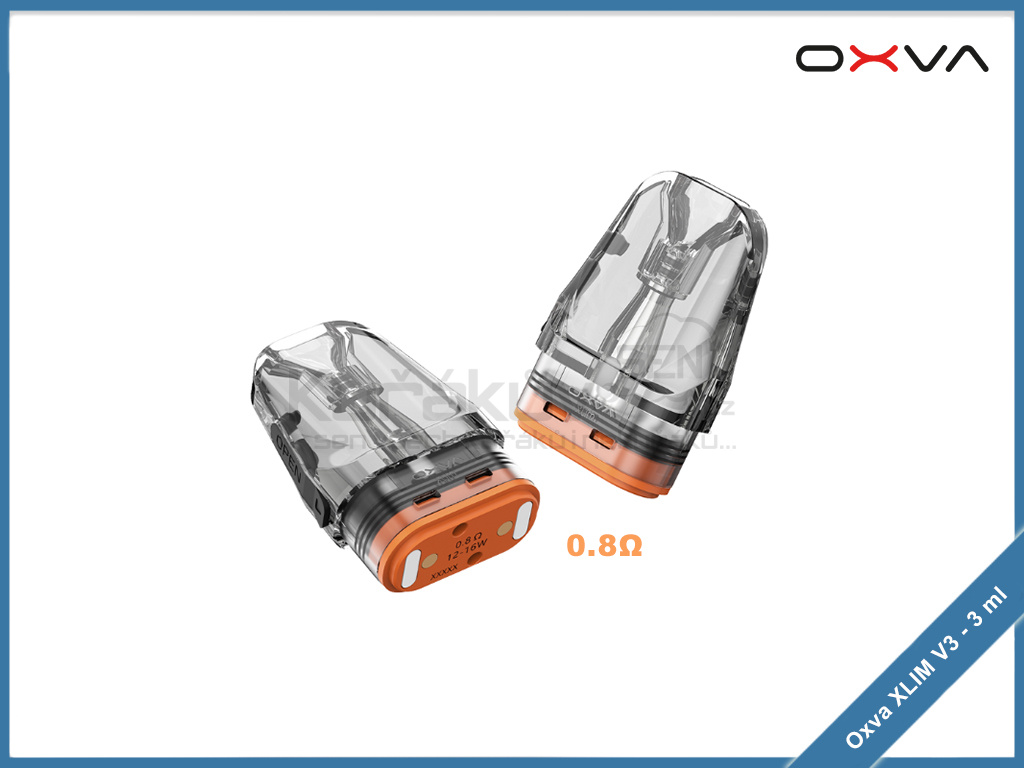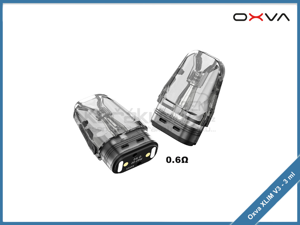 Náhradní cartridge XLIM V3 s bočním plněním pro sérii e-cigaret OXVA Xlim disponuje základním objemem 3 ml. Cartidge dodává jemnou chuť páry a výborně prokresluje chuť e-liquidu. Jedná se o upgradovaný typ cartridge s označením V3 Top Fill, cartridge nabídne pohodlnější plnění se silikonovou záslepkou v boční části, která nezasahuje do těla baterie, je tedy možné doplňovat cartridge připojenou k tělu baterie. Uvnitř cartridge se nachází speciální integrované žhavící tělísko s mesh pletivem v jádru pro výborné podání chuti a jemnou produkci páry.